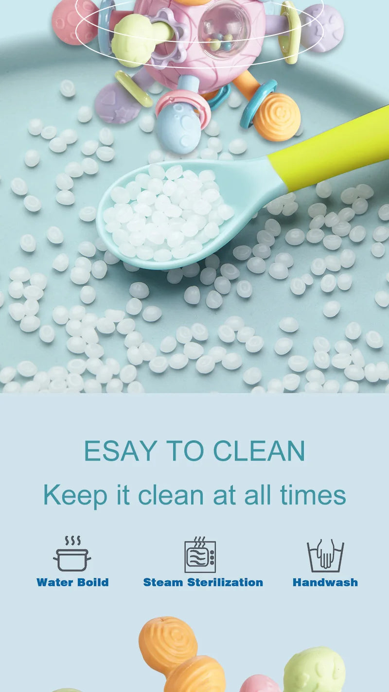 Designed to support early sensory exploration, this rotating rattle ball combines multiple developmental benefits in one versatile toy. The textured silicone surface encourages safe teething while the rotating mechanism inside creates auditory stimulation that captures infant attention. Soft, grasping-friendly design helps strengthen hand coordination and fine motor skills. Easy to clean and made from baby-safe materials, it's an ideal companion for tummy time, playtime, or soothing moments throughout the day.